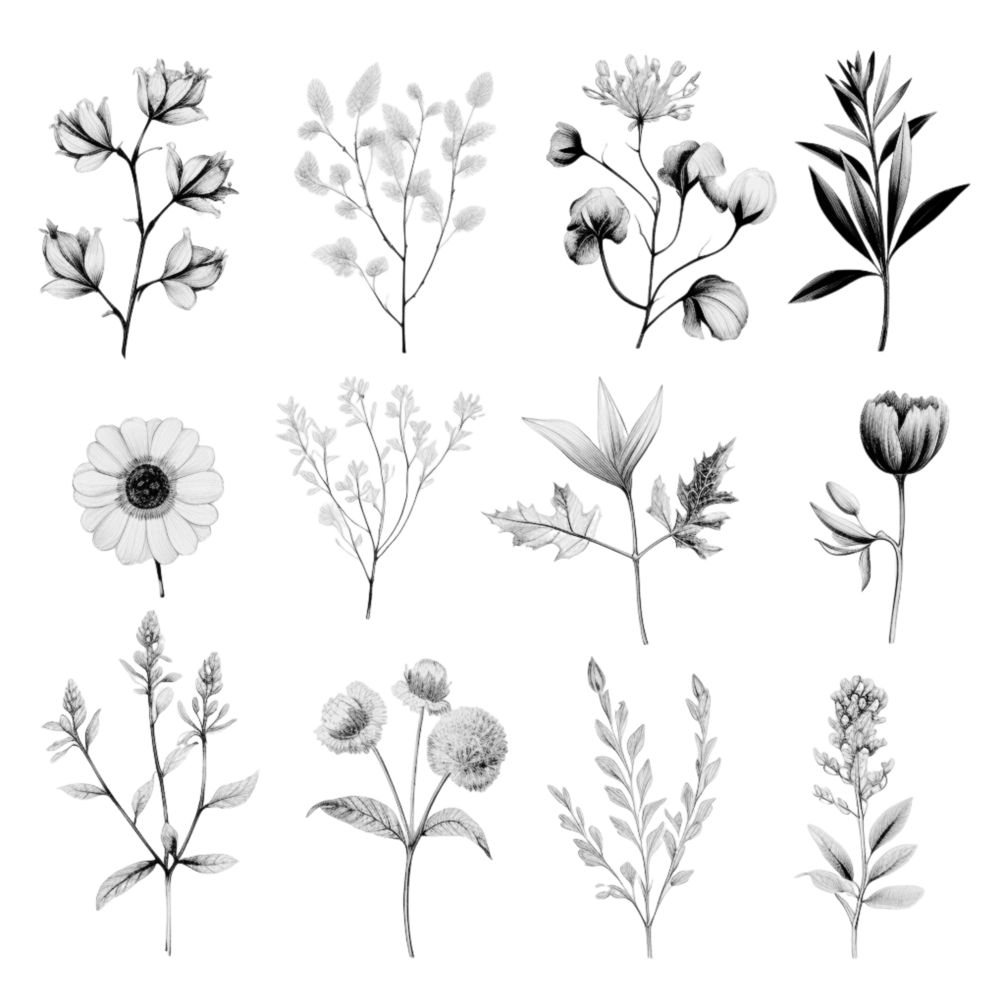 You'll get the "Botanical Harmony" full collection, a captivating ensemble of 215 meticulously crafted rare plant illustrations in timeless black and white, in both Raster (PNG) and Vector (SVG) formats.